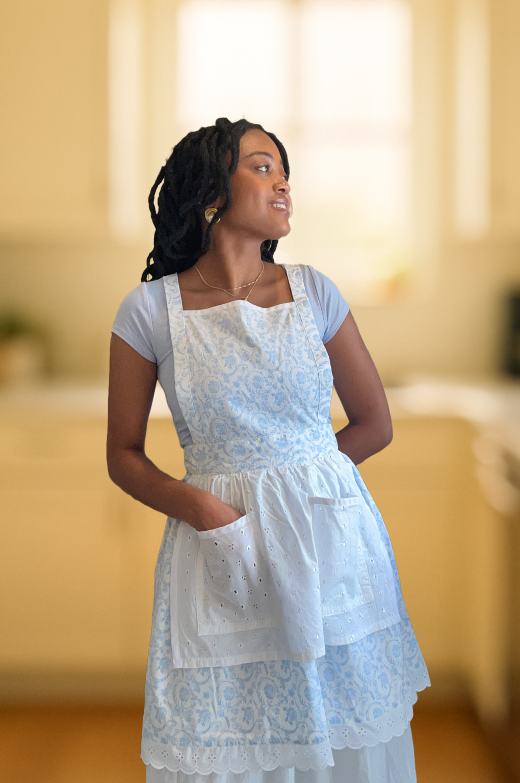 The Cynthia Blue Apron is more than just a kitchen essential - it's a stylish statement piece!
